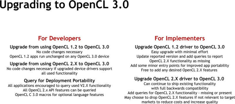A változásokkal a Khronos Group gyakorlatilag abszolút a piaci igényekhez igazodik. Van egy alapvető funkcionalitás, ami kötelező, és itt igen nagy az egyetértés a gyártók, illetve a fejlesztők között. Ezen túlmenően minden opcionális, de nagyon fontos, hogy könnyen lekérdezhető formában, nem úgy, ahogy az OpenCL 2.0 biztosította a meglehetősen monolitikus dizájnjával, tehát az új funkciók elérhetőségéhez nem kell igazodni egy eltérő fő specifikációhoz. Ez leginkább a gyártóknak lesz könnyítés, ugyanis a legtöbben azért nem tudták implementálni az OpenCL 2.0-t, mert a felépítése mindent vagy semmit alapon dolgozott, tehát egy hardver hiába tudott volna támogatni egy funkciót, ha egy másikat lehetetlen volt hatékonyan megoldani rá. Ilyenkor a gyártók egy olyan kényszerhelyzetbe kerültek, hogy végül inkább az OpenCL 2.0 támogatásának a hiányát választották. Jó példa, hogy OpenCL 2.2-es implementációval senki sem rendelkezik, egyszerűen annyira kötött a specifikáció, hogy képtelenség normálisan támogatni a hardverek jó részén, de igazából az erőforrás befektetését sem éri meg, ha egyszerűen magát lövi lábon az API.