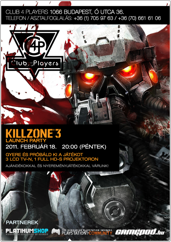 A Platinum Shop, a Playstation Community és a Gamepod támogatásával ismételten launch party a C4P-ben. A rendezvény 2011. február 18-án (pénteken) vagyis a mai napon kerül megrendezésre 20:00 órai kezdéssel. A helyszín VI. kerület Ó utca 36. szám alatt található C4P. A Killzone 3-at LCD TV-ken és HD kivetítőn lehet majd kipróbálni, ajándékok és nyereményjáték kíséretében.
