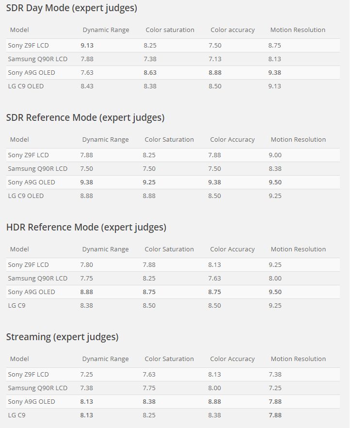 Négy versenyszámban eresztették egymásnak a termékeket, amiből hármat (Best SDR Day Mode, Best SDR Reference Mode, Best HDR TV) a Sony AG9 nyert, a negyedikben (Best Streaming TV) pedig holtversenyben lett első az LG C9-cel. Szóval az összesítésben így a japán gyártó készüléke nyert. Gratulálunk!