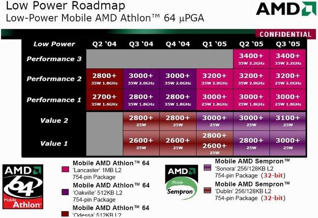 Bár az X-bit labs szerint a nagyobb teljesítményű – és nagyobb fogyasztású – mobil processzorok fejlesztése sem áll le, a most nyilvánosságra került útiterv szerint a sunnyvale-i vállalat még komolyabban kívánja venni a kis energiaigényű CPU-k tökéletesítését. Már a harmadik negyedévben az Oakville kódnevű mag váltja fel az Odessát; az azonos méretű, 512 KB-os L2-cache-sel rendelkező Oakville processzorok teljesítménye 35 watt lesz, és 2800+ (1,8 GHz), valamint 3000+ (2,0 GHz) jelzéssel fognak piacra kerülni. Ebben a kategóriában 2005 elejétől jelennek meg olyan 64 bites processzorok (Lancaster), amelyek csökkentett, 25 wattos fogyasztást tudnak felmutatni.