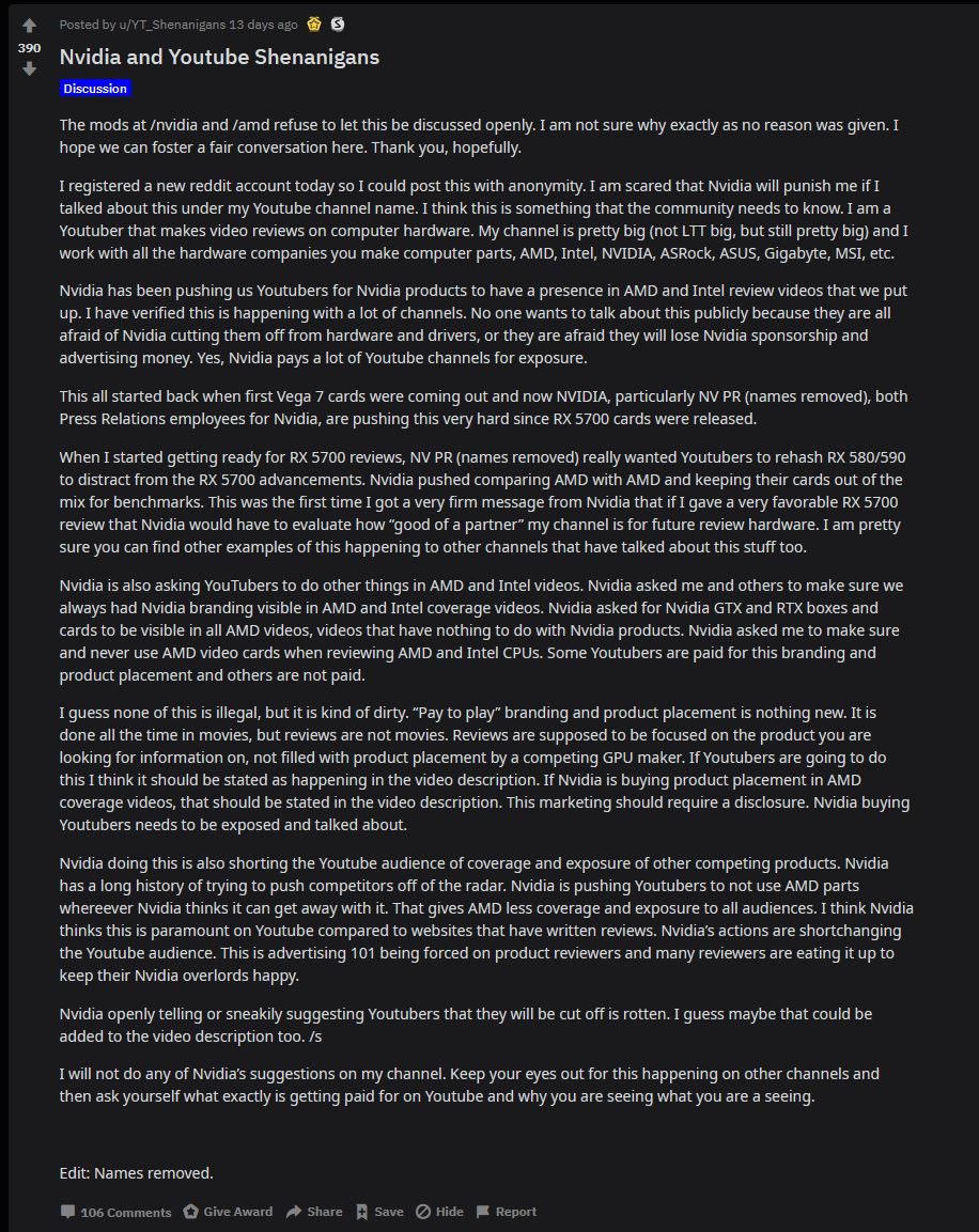Furcsa fejlemények rázták fel az elmúlt órákban a PC-s hardverekkel foglalkozó médiákat, ugyanis egy anonimitás mögé bújó, saját YouTube csatornáját elég nagynak értékelő személy bejegyzést tett közzé a Redditen, amelyben arról ír, hogy az NVIDIA hogyan kontrollálja a youtubereket. Az eredetileg még neveket is közlő, de azóta rekordsebességgel eltüntetett írásról a TechPowerUP készített egy képet, így az utókornak megőrizték a tartalmát, amely lassan végigfut a médián, viszonylag sok kérdést felvetve az előállt helyzettel kapcsolatban.