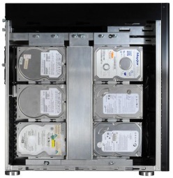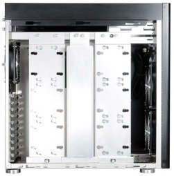 Az igazi érdekessége azonban belül van, ugyanis elég egyedi rögzítési megoldást találtak ki a tárolók számára. Két függőleges tálca található a gépház bal oldalán, amik összesen hat 2,5”-es vagy 3,5”-es HDD-t és SSD-t tudnak megtartani. Az óriási Lian Li ház a következő hónapban jelenik meg a piacon, ajánlott fogyasztói ára pedig 219 dollár lesz.