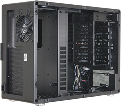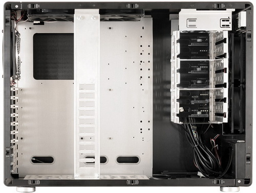A 90 fokban kifordított merevlemezkeret hot-swap rendszerű, azaz a benne tornyosuló adattárolók akár menet közben is cserélgethetők. Itt összesen 6 x 3,5”-es és egy 2,5”-es meghajtó találhat otthonra, de a külső 5,25”-es bővítési lehetőség is felhasználható ilyen célra, sőt, a ház aljába további 3 x 2,5”-es vagy 2 x 3,5”-es HDD/SSD illeszthető. A keret és a táp pozíciója fix, ez 380 mm-es hosszúsági korlátot jelent a videokártyák számára.