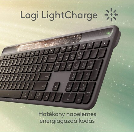 Az ollós dizájnt követő periféria a Signature Slim Solar+ elnevezést kapta, és erőteljesen hasonlít az MX Keys S-re, a lényegi differencia a felső peremén végigfutó fotovoltaikus cellákban testesül meg, amelyek nap-/mesterséges fényből nyerik az energiát a beépített, 10 éves élettartammal kecsegtető akkumulátor számára. A numerikus paddal ellátott, 700 gramm tömegű tasztatúra 430,8 mm széles, 142,9 mm mély, illetve (a hátsó szekciójánál mérve) 20,2 mm magas, és a célgéphez 2,4 GHz-es, USB Type-C-s Bolt vevőegységgel vagy Bluetooth-szal köthető.