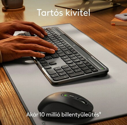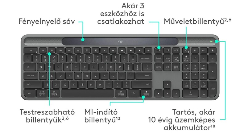 Az egyelőre csak US ANSI kiosztással megvillantott konstrukció kupakjainak kontaktfelülete bemélyedik középen, és a szoftveres hátországát a vállalat Options+ applikációja biztosítja. Az egy időben három masinához kapcsolható újdonság legtöbb extra funkcióját (például médiavezérlők vagy háttérvilágítás) az Fn+[gomb] kombinációkkal érhetjük el, és akad egy külön AI Launch gombja is, ami Windows platformon a Copilotot, ChromeOS alól pedig a Google Gemini asszisztenst indítja el, viszont ha nincs ilyesmire szükségünk, felprogramozható másra (csakúgy, mint a numerikus pad felett lévő társai).