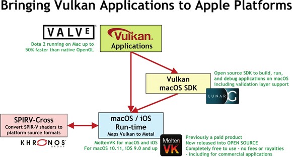 A Khronos Group váratlan, de rendkívül kedvező bejelentést tett az idei MWC-n. A konzorcium a portolható Vulkan konstrukción keretében bejelentette a nyílt forráskódú MoltenVK 1.0-t, ami gyakorlatilag lehetővé teszi a Vulkan API-ra írt alkalmazások futtatását az Apple iOS és macOS operációs rendszereken. Ez a fejlesztők számára rendkívül kellemes lehetőség, ugyanis enélkül vagy az igen elavult OpenGL opciókra írnak támogatást, vagy az Apple saját Metal API-jára, és egyik sem olyan kedvező irány, mint az iparág, mára általános explicit API-jává váló Vulkan.