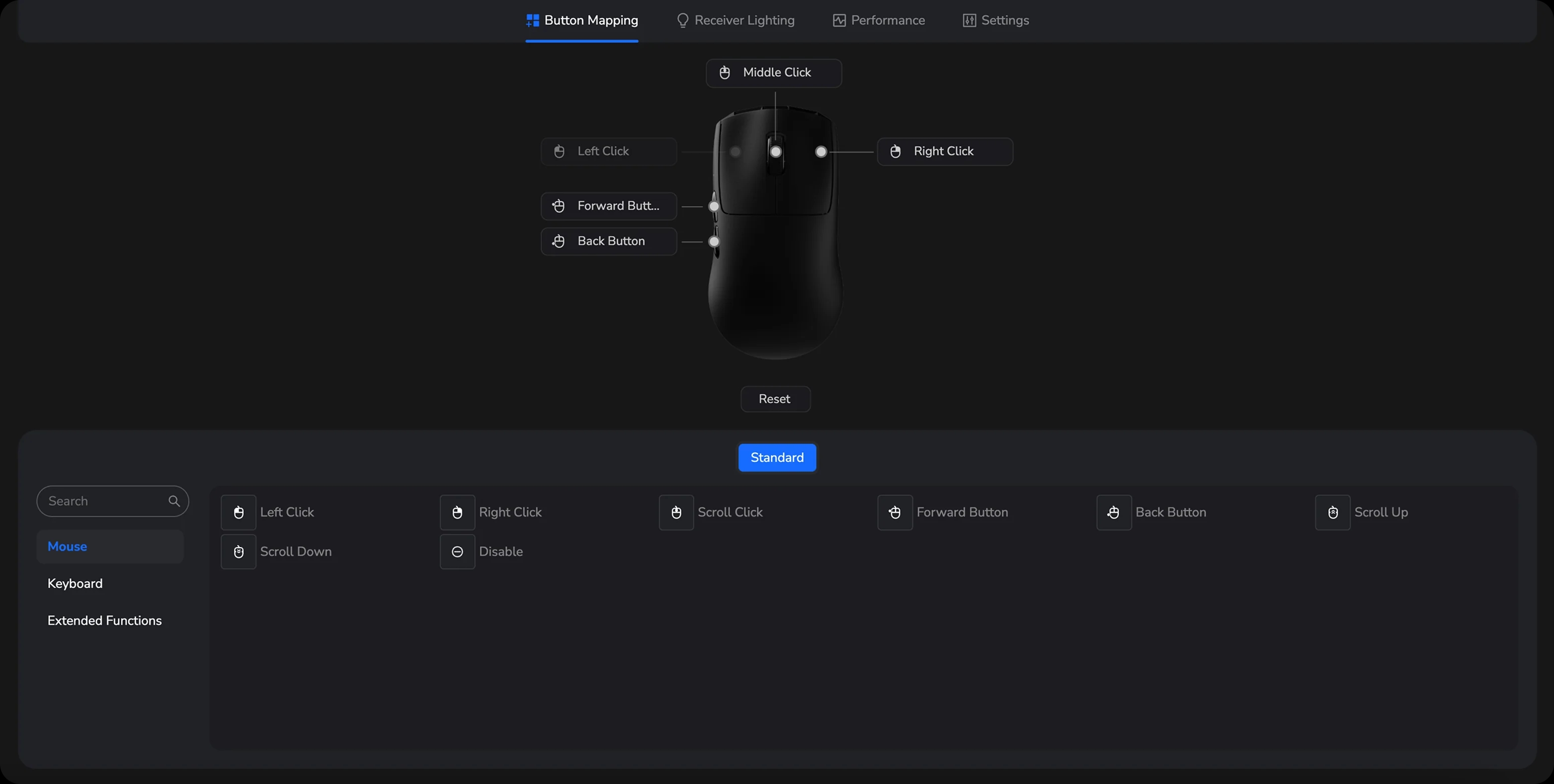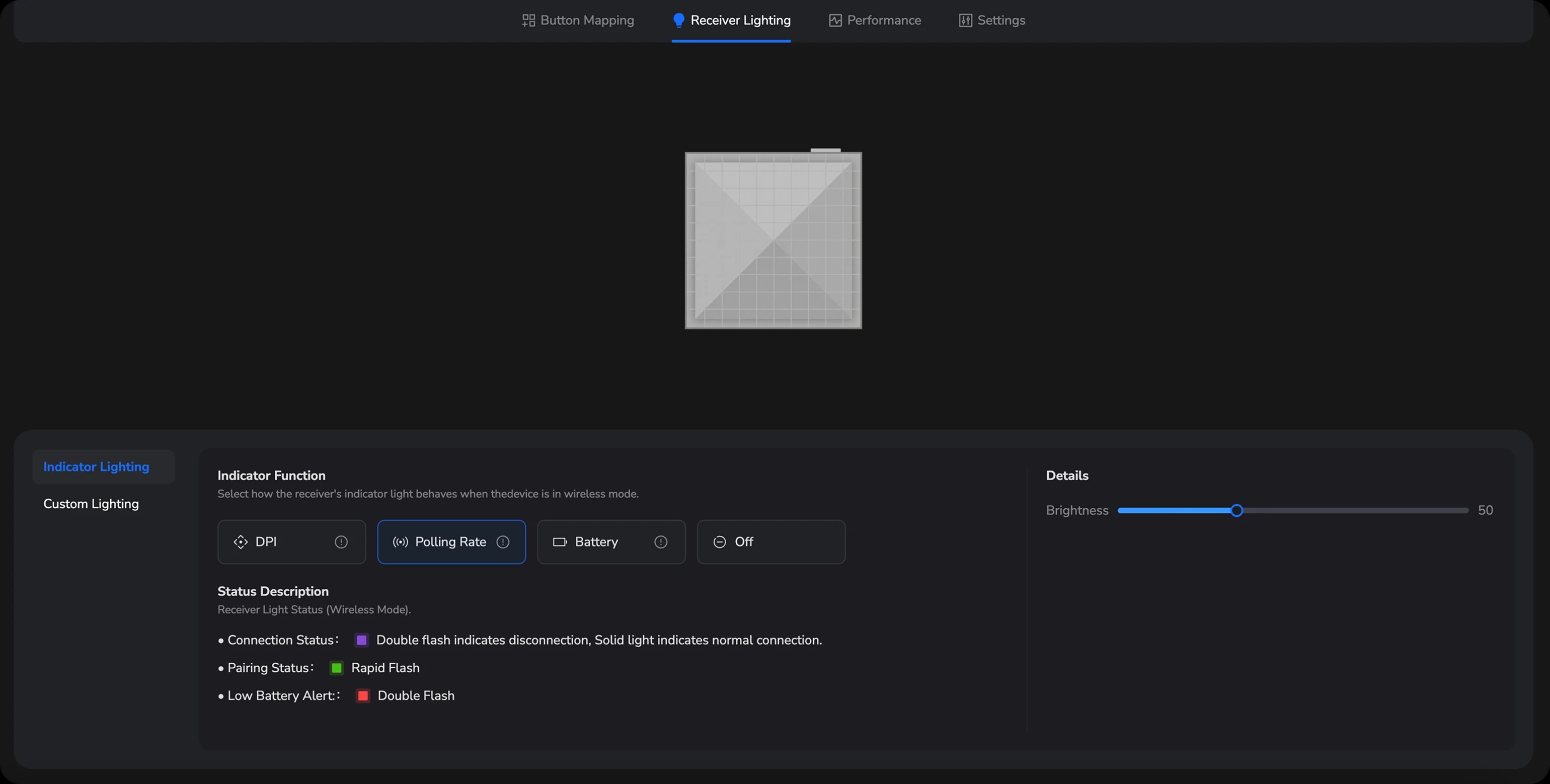 Itt férhetünk hozzá egyébként a érzékelő 20 000 FPS-es módjához (tehát amikor a jelfeldogozó processzor másodpercenként 20 000 felvételt értékel ki a lencse alatt mozgó felületről), ami tovább fokozza a precizitást és reszponzivitást, persze a telepek gyorsabb merülésének fejében. A mellékelt, 8K-s vevőegységet toldóadapterhez hasonlóan a vezeték végéhez csatlakoztatjuk, és kocka alakú, áttetsző házának mélyén egy "minipiramis" figyel, aminek a tetején egy RGB-s, meghajtóprogrammal testreszabható indikátor LED pislákol.