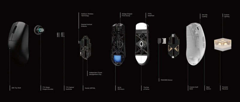 A 124 mm hosszú, 66 mm széles, továbbá 39 mm magas, ötgombos megoldás természetesen 50-től 30 000 cpi-ig skálázódó, 750 ips-os/50 g-s PixArt PAW 3950 érzékelővel dolgozik, és Nordic NRF54L MCU-jának hála mind 2,4 GHz-es, adaptív sávváltást alkalmazó rádióján, mind pedig USB Type-C/Type-A parakábelén keresztül támogatja a 8000 Hz-es mintavételezést. A komfortívekkel ellátott, tenyértámaszról leválasztott főklikkek alá optomechanikus elven működő TTC switch-ek kerültek, míg a textúrázott gumicsíkot viselő görgőkerék 24 léptékű TTC Green Dragon encodert használ.
