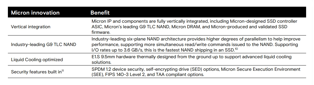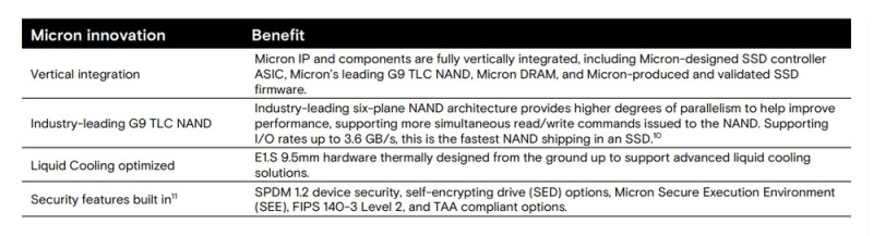 Az 9,5 mm vastag E.1S, valamint E3.S formátumokban még kérdéses kapacitásokkal közelgő, 1.2-es SPDM biztonsági protokollt támogató újdonságok vezérlőjét ellátják SSE processzorral (Micron Secure Execution Environment), így elérhetővé válnak FIPS 140-Level 2 vagy TAA validációval rendelkező opciók az öntitkosítást (SED) végzők kiviteleken túl. Azt még érdemes megjegyezni, hogy az E.1S kivitelű példányok a léghűtés mellett folyadékalapú hőmenedzsmentet alkalmazó rendszerekbe is telepíthetők.