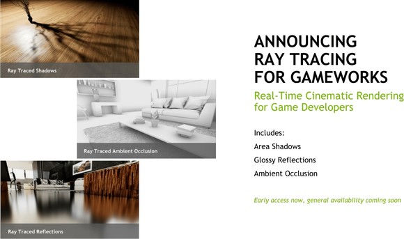 A gyártók szempontjából az NVIDIA már bejelentette, hogy a Volta architektúrára épülő Titan V külön meghajtóval támogatja majd a DirectX Raytracinget, vagyis nem a Microsoft fallback layert használja, így a feldolgozás bizonyos szakaszait gyorsítja, de az még nem derült ki, hogy melyeket. A gyorsítás a GameWorks RTX middleware-en keresztül kihasználható lesz, amely egyelőre három, korai hozzáférés formájában elérhető effektet kínál a fejlesztőknek beépítésre: Area Shadows, Glossy Reflection és Ambient Occlusion. Ezek egyébként sugárkövetés nélkül is megvalósíthatók, de a minőségük nem lesz olyan jó.