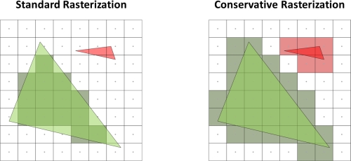 Szintén érdekes újítás a konzervatív raszterizáció hardveres gyorsítása, ami arra szolgál, hogy a raszterizálás a mostani kötött formánál jobb irányíthatóságot kapjon. Mint ismeretes, a normál raszterizálás esetében a háromszög akkor fedi az adott pixelt, ha a mintavételi pont fedi azt. A konzervatív raszterizáció esetében lehetőség van arra, hogy a háromszög akkor is fedje a pixelt, ha annak csak egy nagyon apró része nyúlik bele a pixelbe.