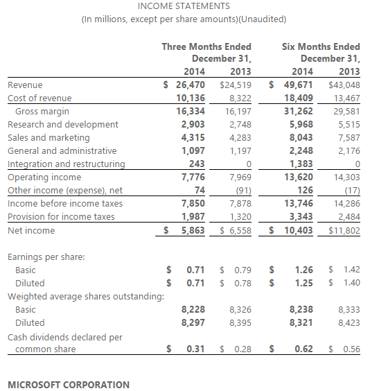 Közzétette negyedéves jelentését a Microsoft. A forgalom 8 százalékkal, 26,47 milliárd dollárra nőtt az egy évvel korábbi adatokhoz képest, a részvényekre jutó eredmény pedig mintegy kilenc százalékkal, 0,71 dollárra csökkent a 2015. második negyedévi (ami a karácsonyi szezont jelenti) jelentése alapján. Az egy részvényre jutó eredményekkel kapcsolatos várakozások is ezt várták, a forgalomtervezés azonban pesszimistább volt, ez 26,33 milliárd dollárral számolt.