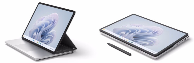 A Corning Gorilla Glass 5-tel védett, 14,4 hüvelykes PixelSense Flow érintőkijelző a 2400 x 1600 pixeles felbontáshoz 120 Hz-es képfrissítési rátát, 1500:1 statikus kontrasztarányt, adaptív fényerőszabályzást, VESA DisplayHDR 400-as minősítést, Dolby Vision IQ-t és gyári kalibrációt társít, ráadásul kezeli a tízujjas gesztusokat is. Ez még nem minden, ugyanis a 180 fokos, úgynevezett "Dynamic Woven Hinge" zsanér segítségével háromféle pozícióban fixálhatjuk a képernyőt (Laptop, Stage és Studio mód). A mechanikus elven működő, háttérvilágításos klaviatúrát megfejelték dedikált médiavezérlőkkel, a haptikus touchpad több szempontból testreszabható, a hálózati halmazban Wi-Fi 6E/Bluetooth 5.3 modul található, és a fedélzetről nem hiányzik a gyorsulásmérő szenzor vagy a giroszkóp sem.