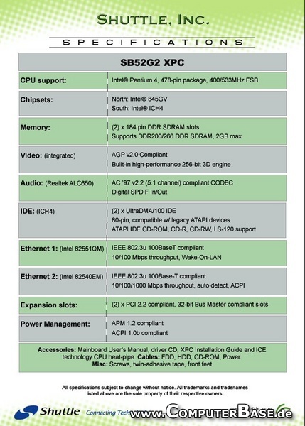 Az alaplap Socket 478 foglalatú, 400 és 533 MHz-es FSB-s Pentium 4 és Celeron processzorokat tud fogadni, amelyeket - a többi mini-PC-hez hasonlóan - a ház ventilátora hűt egy úgynevezett heatpipe segítségével. Az SB52G2 előnye, hogy támogatja a Hyper-Threading technológiát és az azt használó 3,06 GHz-es Pentium 4-es processzorokat is. Memóriaként maximum 2 GB DDR200 vagy DDR266-os RAM jöhet szóba. A két UltraDMA/100 IDE-csatornán maximum négy ATAPI-eszközt csatlakoztathatunk, a házba maximum két 3,5 colos IDE merevlemezt és egy 5,25 colos optikai meghajtót rakhatunk.