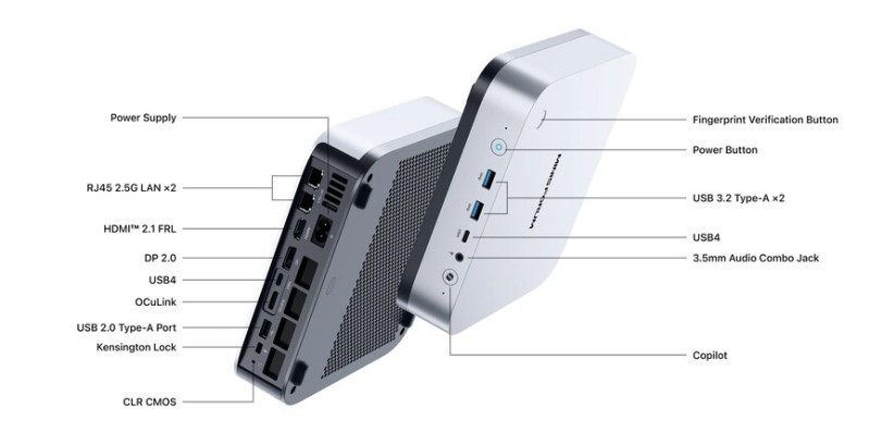 A fémházas konstrukció többi specifikációja (maximum 128 GB SO-DIMM DDR5-5600 memória, három darab, PCI Express 4.0-s M.2 2280 slot, két 2,5 gigabites LAN, Wi-Fi 7/Bluetooth 5.4, egy DisplayPort 2.0, egy HDMI 2.1 FRL kimenet, két, 15 wattnyi energiát közvetítő, DisplayPort alt módos USB4 Type-C kapu, két USB 3.2 Gen 2 Type-A konnektor, egy USB 2.0 aljzat, OCuLink csatoló, SD kártyaolvasó, 3,5 mm-es kombójack, két fedélzeti mikrofon, hangszórók) maradt a régiben.