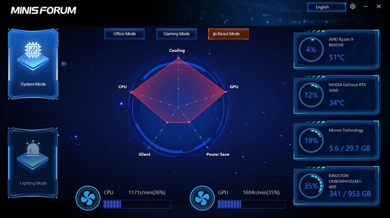 A 3,8 literes térfogatú gép elején csipetnyi RGB világítás pislákol, és központi egységének hűtéséről egy 3600 rpm-es ventilátorral, továbbá öt (réz) hővezető csővel megtámogatott rendszer gondoskodik, amely a meleget két irányban fújja ki a beltérből a szellőzőréseken keresztül. A szoftveres hátországot a gyártó Control Center applikációja testesíti meg, amiben a monitorozáson, a címezhető fények babrálásán és a légkavarók vezérlésén felül lehetőségünk nyílik három, CPU-ra vonatkozó fogyasztási keretet befolyásoló üzemmód közül választani (Office – 60 watt, Gaming – 80 watt, Beast – 100 watt).