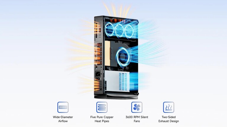A 315 mm magas, 57 mm széles, illetve 215 mm mély, 3,81 kilogramm tömegű masina két memóriafoglalatjába legfeljebb 96 GB-nyi, 5200 MHz-es effektív órajelre hangolt DDR5 RAM-ot pakolhatunk, míg kompakt háttértárolóinkat két, PCI Express 4.0-s M.2 2230/2280 slot várja, amelyek maximum 4 TB-os SSD-ket tudnak elszállásolni. A hálózati fronton Wi-Fi 7 és Bluetooth 5.4 modul egészíti ki az 5 gigabites, Realtek RTL8126 kontroller által hajtott Ethernetet, miközben az energiaellátás feladatát egy 350 wattos tápegység vállalta magára.