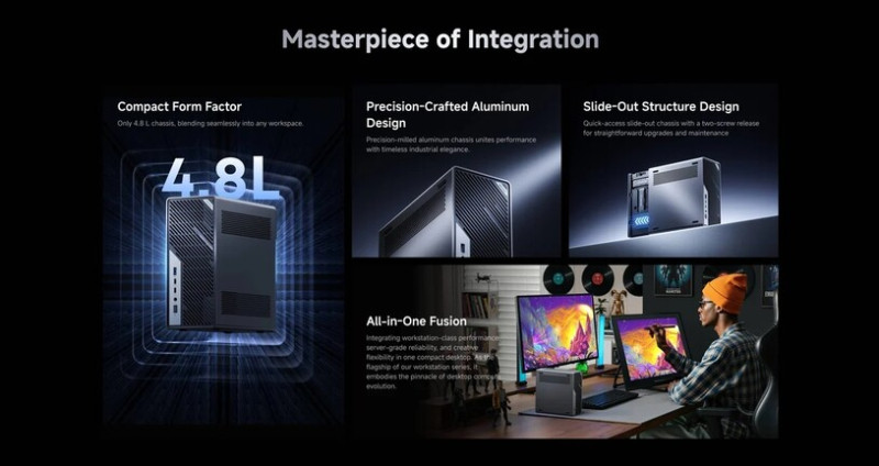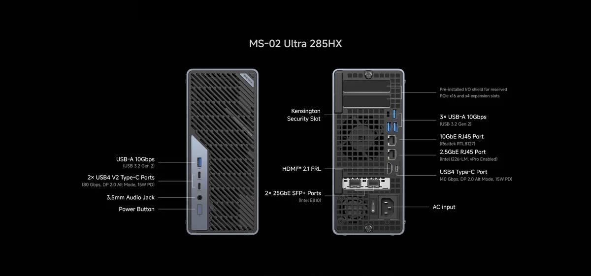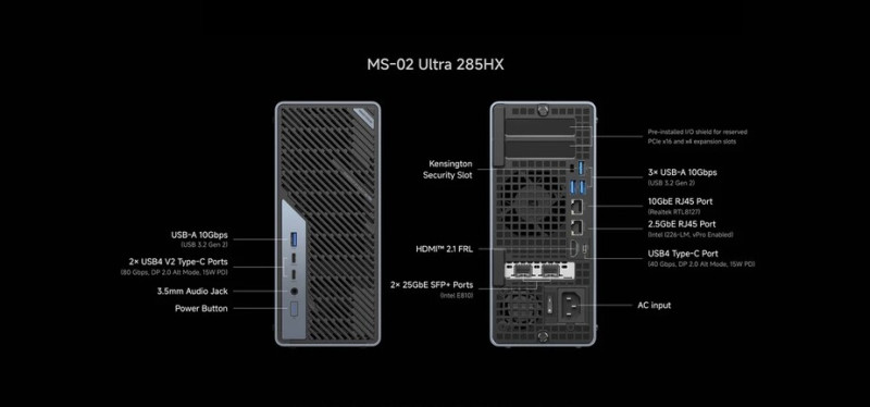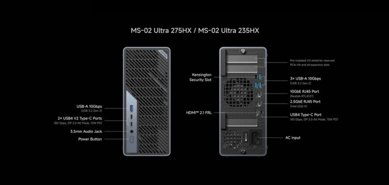 A kétslotos grafikus vezérlővel bővíthető, 350 wattos – 1U magas – tápegységgel hajtott konstrukció alaplapjára egy 10, valamint egy 2,5 gigabites Ethernetet integráltak (az előbbit Realtek RTL8127, az utóbbit pedig Intel I226-LM kontroller dirigálja), de az Intel BE200-as Wi-Fi 7/Bluetooth 5.4 egység sem hiányzik az arzenáljából. Az alumíniumházból kicsúsztatható belső hűtéséről egy két ventilátorral (egy 70 x 70 x 25, meg egy 60 x 60 x 20 mm-es) és hat hővezető csővel kiegészített rendszer gondoskodik, miközben a CPU-nak és GPU-nak saját légcsatornái vannak.