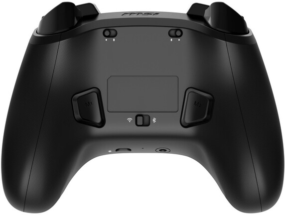 A 148 x 111 x 68 mm-es fizikai méretekkel bíró konstrukció 230 grammot nyom a mérlegen, és Hall-effektusos ravaszainak aktuációs távolságát két szintre lőhetjük be a kétállású reteszkapcsolóknak hála. Alul, a mikrofon némítását kezdeményező gomb társaságában egy 3,5 mm-es kombójack állomásozik a headsetünk számára, és a hátul lévő M1/M2 gombokat az MSI Center applikációban programozhatjuk.