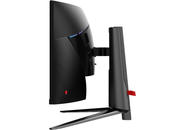 A hátulján csipetnyi hangulatvilágítással feldobott, egyelőre kérdéses árazású periféria kábelvezetővel ellátott talpazata 100 x 100 mm-es VESA rögzítőpontba kapaszkodik, és a pivotba forgatás kivételével mindenhogy mozgatható.