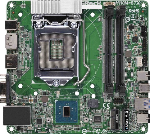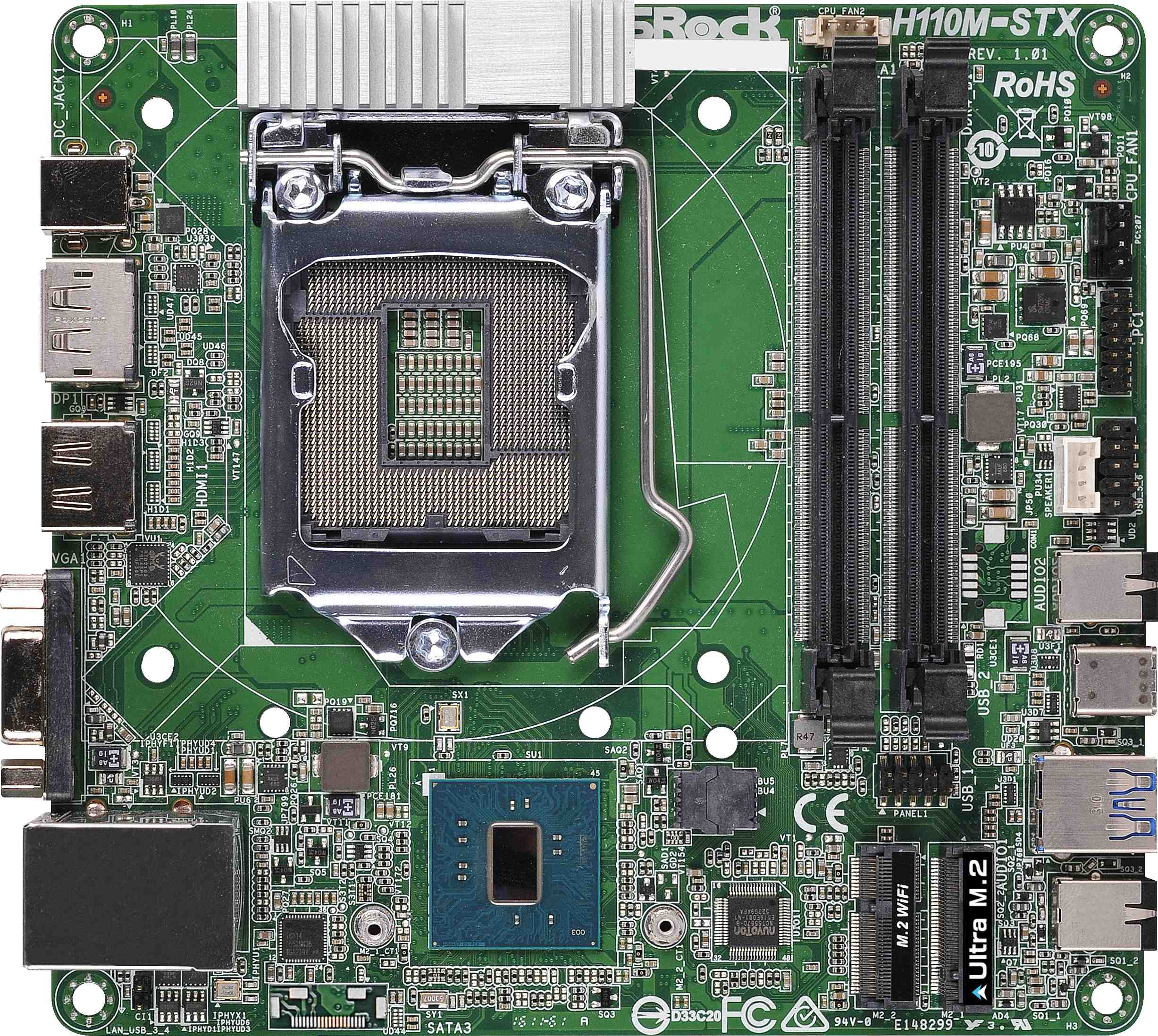 A szóban forgó alaplap Intel LGA1151-es foglalattal rendelkezik, ezáltal bármilyen ezzel kompatibilis processzor behelyezhető 65 wattos TDP-ig, a foglalat körül pedig annyi helyet hagytak, hogy speciális hűtésre sincs szükség, akár a CPU-hoz mellékelt gyári hűtő is ráhelyezhető. Memória fogadására két darab DDR4 kompatibilis SO-DIMM csatoló áll rendelkezésre, míg az adattárolók számára egy PCIe 3.0 x4 M.2, valamint kettő SATA 6 Gbps port vehető igénybe. Utóbbi nem a hagyományos kialakítást követi, mivel a 19 voltos külső tápegység nem teszi lehetővé a SATA tárolók közvetlen tápellátását, ezért kombó kábeleket mellékelnek az alaplaphoz, amivel az adatátvitelt és a tápellátást is megoldják – tehát utóbbit is közvetlenül az alaplapról.