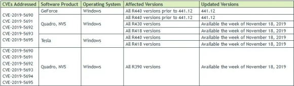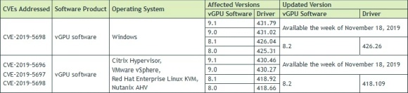 Az NVIDIA bejelentette, hogy az elmúlt időszakban kilenc sebezhetőséget foltoztak be (CVE-2019-5690, CVE-2019-5691, CVE-2019-5692, CVE-2019-5693, CVE-2019-5694, CVE-2019-5695, CVE-2019-5696, CVE-2019-5697 és CVE-2019-5698), amelyek közül három veszélyesnek tekinthető. A cég arra kéri a Windows 7 vagy újabb operációs rendszert, illetve Citrix Hypervisor, VMware vSphere, Red Hat Enterprise Linux KVM és Nutanix AHV virtualizációs platformot használó ügyfeleiket, hogy a biztonsági rések jelentette veszély ellen védekezzenek a legfrissebb eszközillesztők telepítésével.