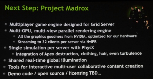 Az NVIDIA a problémát a gyökereknél kezelné, így jó ideje fut a Project Madrox kódnevű fejlesztés, mely egy olyan játékmotor lesz, amit a zöldek alapjaiban a felhős játékhoz terveztek, ráadásul kifejezetten többjátékos programokhoz, vagy történetorientált kooperációs játékmenethez. Fontos, hogy egyjátékos módra kihegyezett programokhoz ez a motor nem ideális, mert elveszti mindazt az előnyt, amit a működése ad.