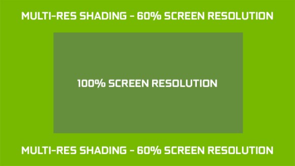 A Multi-Res Shading funkció a második generációs Maxwell, illetve a Pascal architektúrára épülő GeForce-okon aktiválható, továbbá két beállítási lehetőség választható. A konzervatív opció a képkocka szélét a natív felbontás 60, míg az agresszív 40 százalékával képezi le, és a képminőség csökkenése is ennek megfelelő lesz. A csökkentett minőségű leképezés mindkét esetben nagyjából 20-20%-nyi területre történik meg a képkocka mind a négy szélén.
