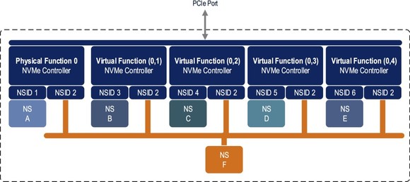 A másik nagy újítás az SR-IOV (Single Root I/O Virtualization) támogatása, ami ugyan megengedett volt az 1.2-es specifikációban is, de nem volt kidolgozva a háttere, tehát végeredményben nem igazán lehetett használni. Az 1.3-as specifikáció biztosít egy szabványos virtualizációs funkcionális alapot, amely definiálja, hogy az SR-IOV képességet hogyan lehet konfigurálni és elérni. Ez az újítás jelentősen kiterjesztheti az NVMe névtér menedzsmentjét, amelyet eddig leginkább az NVM Express over Fabrics specifikációval volt hasznos, de mostantól egy tároló is képes lesz több névteret használni az adattárló particionáláshoz amellett, hogy számos virtuális vezérlő hozzárendelhető a különböző virtuális gépekhez. Ez lehetővé teszi, hogy a névtér a virtuális gépekhez tartozzon, vagy megosztható legyen ezek között anélkül, hogy ehhez bármi változtatás kellene az NVMe meghajtóban, vagy olyan hypervisor implementáció igénye nélkül, amely saját kötetmenedzsment réteget tenne szükségessé.