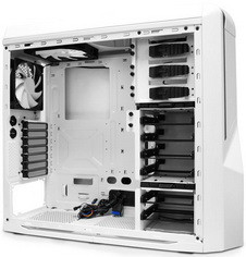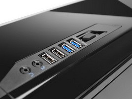 Az előlapi ajtó 3 x 5,25”-es meghajtóhelyet rejt, ez is kettővel kevesebb a „sima” Phantomhoz képest, de az esetek többségében még így is bőven elegendő. A tetőlapon lévő I/O panel balról a jobb oldalra költözött, itt a szokásos audio csatlakozók mellett 2 x USB 2.0, 2 x USB 3.0 és egy ventilátorvezérlő található. Az utóbbi összesen 4 légkavaró szabályozására képes 30 wattos összfogyasztásig bezárólag, a fordulatszám egyszerűen egy három állású kapcsolóval módosítható.