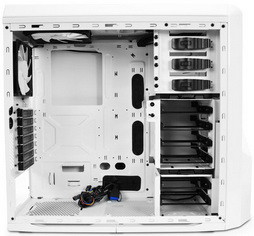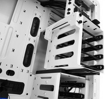 A szerszámmentesen szerelhető beltér sem tartogat sok újdonságot, a 90 fokban kiforgatott merevlemez keretbe fiókok segítségével 6 x 2,5”/3,5” HDD/SSD rögzíthető. Az alaplaptálcán szerelőablak és gumipaneles kábel bujtató rések is találhatók, ATX, micro-ATX és mini-ITX alaplapokat fogad, E-ATX deszkák viszont már nem férnek be. A hűtés gyárilag négy ventilátort tartalmaz, egy 120 mm-es elülsőt, egy 120 mm-es hátsót, egy 140 mm-es oldalsót és egy 140 mm-es felsőt. A ház tetejébe egy 240/280 mm-es folyadékhűtő radiátor is beépíthető, ehhez 30 mm magasság és hátul tömlő furatok állnak rendelkezésre. A merevlemez keret egy részének eltávolításával maximum 305 mm hosszú videokártyákat installálhatunk a rendszerbe, itt érezhető igazán a „kurtítás” az előd nyújtotta 350 mm-nyi helyhez képest.