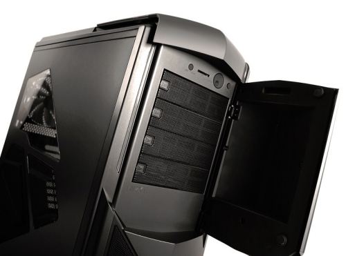 Mint említettük, a ház LED-es külső és belső megvilágítást kapott, ami nem teljesen elítélendő, hiszen amellett, hogy több színben pompázik, akár ki is kapcsolható. Ötletes megoldás, hogy egy külön gombbal aktiválható az alaplapi kivezetéseket megvilágító LED, hogy sötétben könnyebb legyen kotorászni a gép mögött. A LED-ek színének és intenzitásának variálásához szükséges kezelőszervek a kinyitható előlap mögött kaptak helyet, egy SD szabványú memóriakártyákat fogadó kártyaolvasóval egyetemben. A ház tetejére száműzték az I/O panelt, ami jelen esetben több részből áll. A bal szélre került a nem kevesebb, mint hat (négy 2.0-s és kettő 3.0-s) darab USB aljzat, míg az ellentétes szélen a hangcsatlakozók és a beépített négycsatornás (maximum 4x15 W) ventilátorvezérlő gombjai terpeszkednek. Sajnos a megannyi extra mellett külső tárolók csatlakozási lehetőségére nem gondoltak a tervezők.
