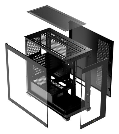 A 454 mm magas, 218 mm széles, illetve 434 mm mély, 7 bővítőhelyes miditorony balján és frontján – 4 mm vastagságú – edzett üveglapok nyugszanak, miközben a beépített hardverek tisztaságára két, mágnesesen rögzített porszűrő betét vigyáz. Komponenseink hőmérsékletét legfeljebb tíz ventilátorral segíthetjük kordában tartani, de a vizezés elkötelezett híveiről sem feledkeztek meg a tervezők, hiszen két radiátor beköltöztetése biztosított, amelyekből az egyik 360, a másik pedig 240 mm-es lehet. Klasszikus kivitelű háttértárolók tekintetében két 2,5, plusz két 3,5 hüvelykes meghajtóban gondolkodhatunk, és az alul-felül gazdagon perforált tápkamra nem ér el teljesen a géplak elejéig, hogy ott több szabad helyünk maradhasson.