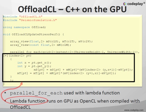 A Codeplay néven ismert céget elsősorban a rendkívül hatékony fejlesztőkörnyezetei miatt tartják nagyra a piacon, így számos játékfejlesztő épít a PlayStation 3-hoz készült Offload csomagjukra, mellyel a Sony konzoljában lévő heterogén módon programozható Cell processzor rendkívül hatékonyan kihasználható. Az Andrew Richards által vezetett vállalat azonban a fejlett fordítók, illetve a különböző programozási technikák területén is komoly tapasztalattal bír, és lassan tíz éves GPGPU-s tapasztalattal a hátuk mögött végleges formába öntötték az OffloadCL nevű fejlesztőkörnyezetet, mely nem kevesebbet kínál a fejlesztőknek, mint a C++ kódok OpenCL-t támogató grafikus vezérlőkön való futtatását.
