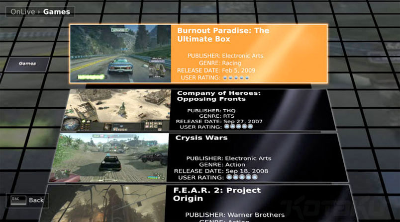 Az Onlive sokak számára még mindig meglehetősen utópisztikusnak tűnik, hiszen nehezen emészthetőnek tűnik manapság, hogy akár egy netbookkal is a legújabb játékokkal játszunk. Mindazonáltal bármennyire is hihetetlennek tűnik igazán csábító ajánlat. Ha minden jól alakul akkor e hónap végén Amerikában be is mutatkozik a rendszer és nyitásnak 20 játékkal indít. Az EA, Ubisoft, Warner, THQ és a Take-Two kínálatából válogatva. Olyan játékok lesznek majd elérhetőek, mint az Assassin's Creed 2, az új PoP, a Dragon Age vagy éppen a Metro 2033. Vagyis kellően impozáns kínálattal rendelkezik már most az elején is. Természetesen a Sony és a Microsoft semmi jót nem nyilatkozott még eddig a rendszerről, véleményük szerint ez jelenleg még nem elég kiforrott, és nincs meg hozzá a kellő technológiai erő.