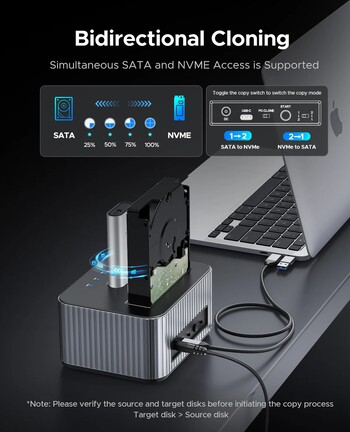 A kompakt flash tárhelyeket 8, a merevlemezeket 22 TB-os kapacitásig kezelő szerkezet mindkét slotján keresztül támogatja a kétirányú klónozást, ám azt célszerű észben tartanunk, hogy ilyenkor a céllemez először formázásra kerül.
