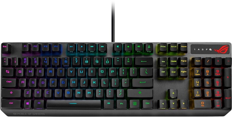 A billentyűzeteknél a Scope RX az újdonság, illetve inkább az, ami benne van: egy saját fejlesztésű optomechanikus kapcsoló, a ROG RX Red. Karakterisztikájában a klasszikus „red” kapcsolókat hivatott követni, lineáris ellenállással, kattanás nélkül. A kapcsolási pont 1,5 mm-nél van, az ellenállás 40 cN, és ez a kapcsolás után 55 cN-ra növekszik. A mérnökök a ROG RX Red-et vastagabb kapcsolószárral tervezték, így kevésbé billeg, a kupakok pedig egyedi, négy tüskés megoldással rögzülnek. Az új kapcsolóval bemutatkozó Scope RX egy viszonylag visszafogott, szigetes klaviatúra, természetesen RGB világítással, alumínium alaplemezzel, IP56-os víz- és porállósággal és egy USB 2.0 átmenő csatlakozóval.