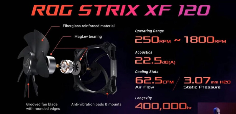 A Noctua nyomdokaiba lépve érkezik a következő újdonság, a ROG Strix XF 120 ventilátor, amely egy 12 cm-es, PWM vezérlésű eszköz, 62,5 cfm térfogatárammal és 3,07 mmH2O statikus nyomással. A mágneses csapágyazású, elsősorban házhűtésre kihegyezett XF 120 tervezésekor mindent bevetettek, üvegszálas műanyagot, rezgéscsillapító felfüggesztést, speciális alakú lapátokat, és így tovább. A 250 és 1800 rpm közötti fordulatszámon (vagy 0 rpm-en) használható termék a negyedik negyedévre várható.