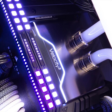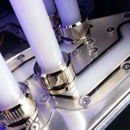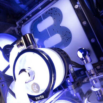 A rendszer hőmérsékleti mutatóit egyedi EK WB disztribúciós plate-ekkel és kiegyenlítőtartályokkal, továbbá D5 pumpával operáló vízhűtés tartja kordában, ami két 360 mm-es Corsair Hydro X XR7 radiátort használ, de a beltérben található ventilátorok tekintetében sem filléreskedtek a konfiguráció megálmodói, ugyanis az Aqua Computer Aquaero 6 LT USB PWM/RGB kontroller hat 120 mm-es Noctua NF-A12x15 PWM chromax.black, illetőleg egy 92 mm-es Noctua NF-A9x14 PWM chromax.black légkavarót vezérel.
