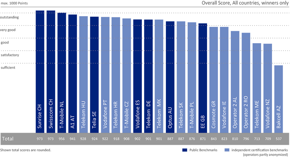 Az idei felmérésben az első két helyen svájci vállalatok végeztek, a Sunrise és a Swisscom (973-973 pont), míg a dobogó harmadik fokára a tavalyi első, a holland T-Mobile (956) állhatott fel. A negyedik az osztrák A1 lett 941 ponttal, az ötödik helyezést pedig a magyar Telekom érte el 928 ponttal.
