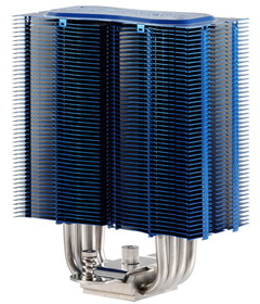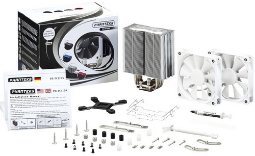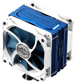 A jelek szerint a Phanteks továbbhaladt ezen az úton, ugyanis bemutatták PH-TC12DX jelölésű CPU-hűtőjüket, amely az alap ezüst mellett kék, fekete és piros színben is elérhetővé vált. A felépítése mondhatni klasszikus duplatornyos, vagyis a négy darab, U alakban meghajlított, 6 mm átmérőjű hővezető csövön két oszlopban csoportosulnak az alumínium lamellák. A hűtő kiterjedése a két ventilátorral 126 x 157 x 160 mm, tömege 880 gramm, vagyis ebből a szempontból az erős középkategóriához tartozik.