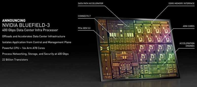 Az NVIDIA a fentieken túlmenően bejelentette még a Bluefield-3-at is, amely termékcsalád a korábban felvásárolt Mellanox technológiáját viszi tovább. Az új, 400 Gbps-os DPU (Data Processing Unit) 22 milliárd tranzisztort használ, a belsejében pedig számos specializált blokk mellett 16 darab ARM Cortex-A78 várja, hogy a hálózati funkciók nagy részét feldolgozhassa, ezzel tehermentesítve a host processzort. Itt érdemes megemlíteni az Aerial A100 nevű, PCI Express csatolóba helyezhető gyorsítót is, amely az A100-at ötvözi egy Bluefield-2-vel. Ezt az 5G-s bázisállomásokba szánja az NVIDIA.