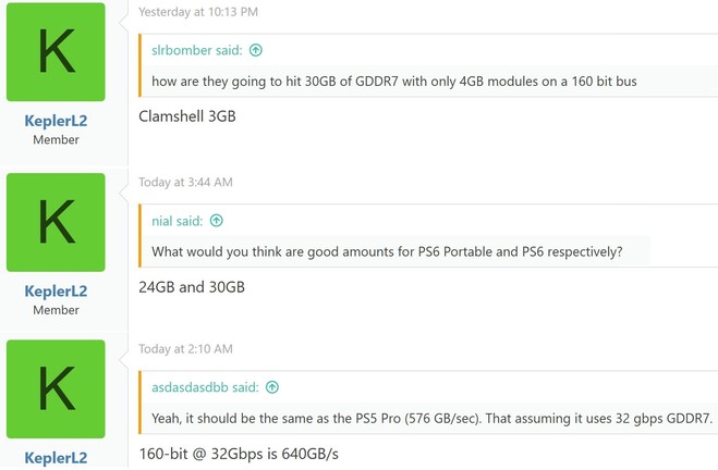 A Sony hardverekkel kapcsolatos dolgokat árgus szemekkel figyelő (no meg kiszivárogtató), KeplerL2 néven ismert felhasználó egy érdekes infómorzsát hintett el a NeoGAF fórumon, miszerint a PlayStation 6 30 GB GDDR7 memóriával fog érkezni, és ezt úgy valósítanák meg, hogy 3 GB-os modulokat kagylóhéj-elrendezésben (clamshell) integrálnának a masina alaplapjára (tehát a chipeket a nyomtatott áramköri lap mindkét oldalára felforrasztanák, egymással szemben, hogy aztán azok párban osztozzanak meg a címező-, illetve vezérlőbuszon a saját adatbuszaik megtartása mellett).