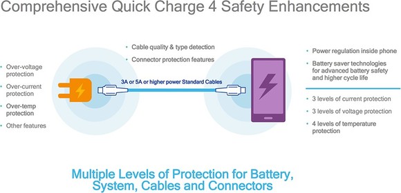 Komoly figyelmet kapott a biztonság is, amire a vásárlók is egyre inkább figyelnek az utóbbi hónapok eseményei után. Már a Quick Charge 3.0-t érték támadások ebből a szempontból, de ezeket a Qualcomm megpróbálta elhárítani. A Quick Charge 4.0 azonban bevezet pár újítást, mint például a túlfeszültség, illetve a túláram, valamint a négyszintű túlmelegedés elleni védelmet. Ráadásul ez az egész rendszerre vonatkozik, vagyis a töltőre, az energiamenedzsmentért felelős áramkörre, az akkumulátorra, továbbá még a kábelre is, amit a Quick Charge 4.0 szintén érzékel, így túltöltés elleni védelmet is kínál.