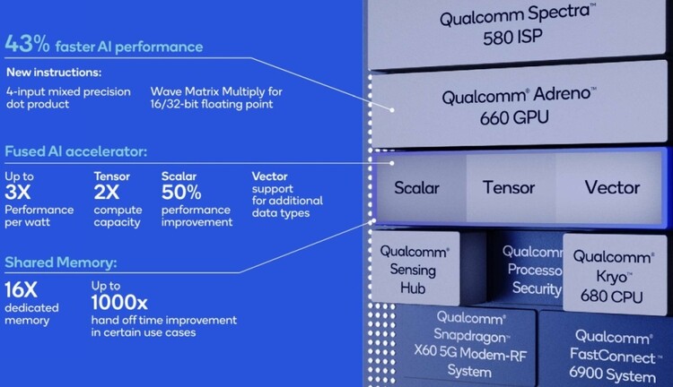 Az AI teljesítmény szempontjából a Qualcomm 26 TOPS-ot számol, amiben benne van az összes részegység, vagyis a DSP-n és az NPU-n át a specifikus gyorsítók, az IGP és a CPU is. Viszonylag sokat változott a Hexagon, amelynek a 780-as változata került beépítésre, de a gépi tanulás szempontjából a kombinált képességek a lényegesek, így a DSP és az NPU mellett az IGP is sokat számít. Az Adreno 660 éppen ezért ki van egészítve mátrixszorzást megvalósító operációk támogatásával, míg a Hexagon blokkon belül a skalárfeldolgozók teljesítménye 50%-kal nőtt, a Tensor feldolgozók tekintetében pedig kétszeres az előrelépés. Ezeknél is sokkal fontosabb, hogy a 16-szor nagyobb belső SRAM memória, ami lehetővé teszi a nagyobb neuronhálókkal való hatékony munkavégzést.