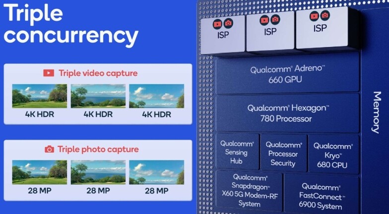 Mivel a Snapdragon 888 már 5 nm-es node-on készül, egészen pontosan a Samsung eljárásán, belefért az 5G-s, X60-as modem integrálása, ami elvárható lépés volt, hiszen a jövőre érkező csúcstelefonoknál az 5G támogatása alapkövetelmény lesz. Érdekes lépés még a három DSP, ami három kamera konkurens kezelését is megoldja.