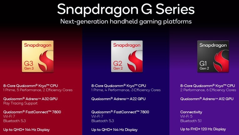 A Qualcomm bejelentette, hogy frissítik a Snapdragon G sorozatot, amely így három, androidos kézikonzolokba szánt rendszerchippel bővült. Ezek ismert paramétereit az alábbi táblázat részletezi: