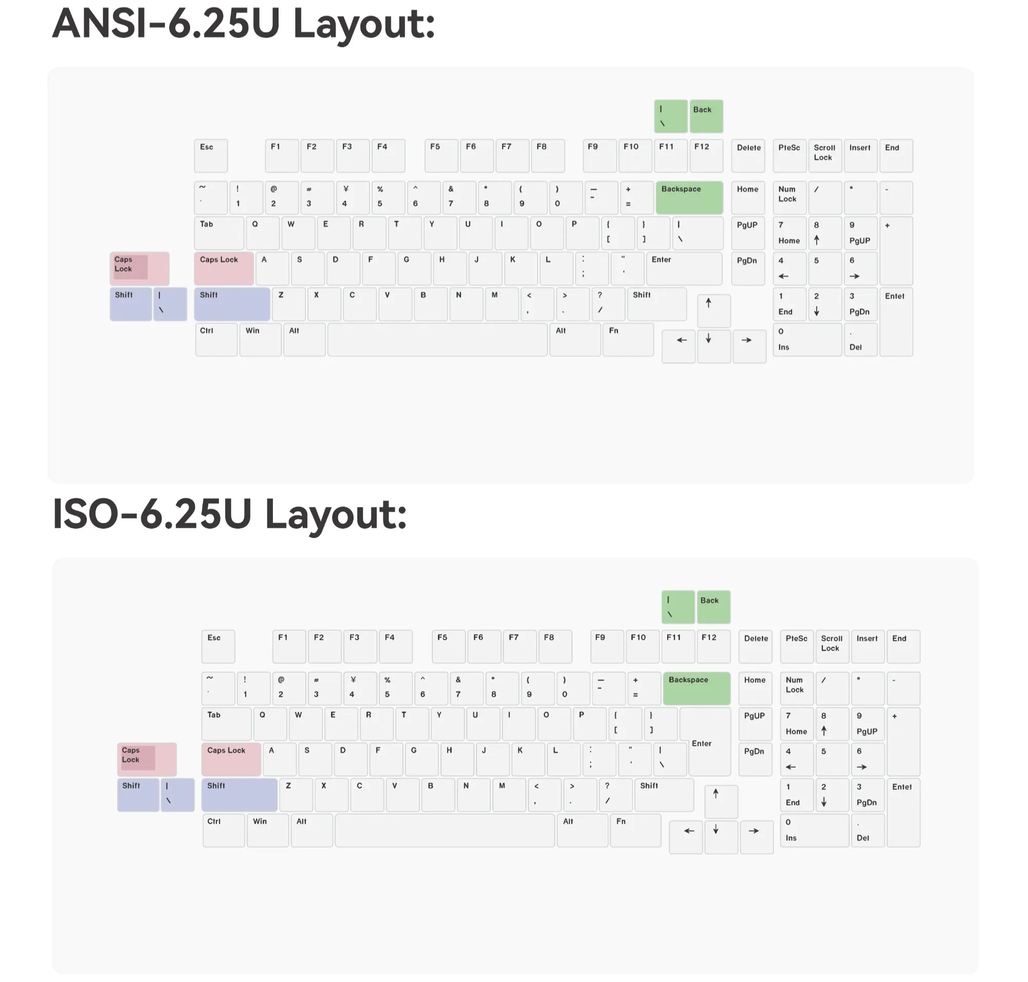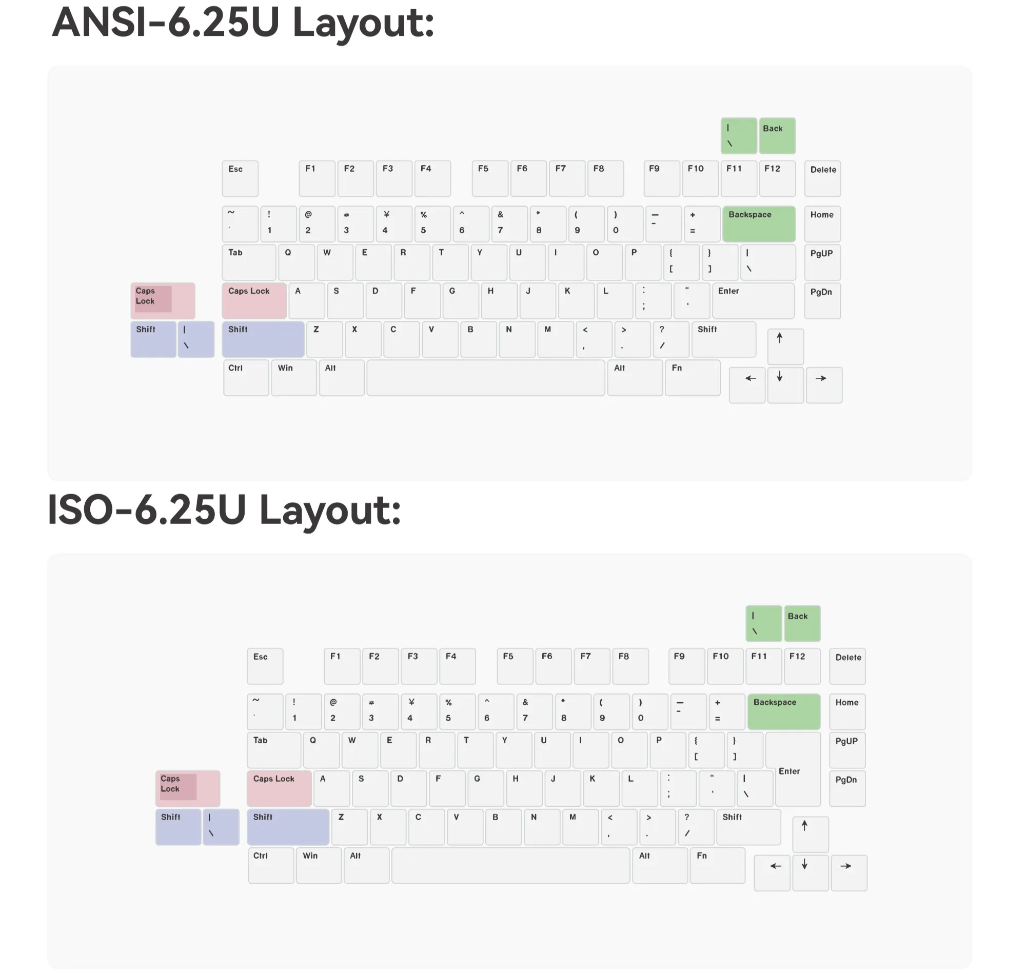Mindkét jószág támogatja az US ANSI és ISO gombkiosztást (6,25u széles spacebarral), az osztott backspace-t, no meg a lépcsős capslockot, és választható színek tekintetében hét alternatíva szerepel az "étlapon".