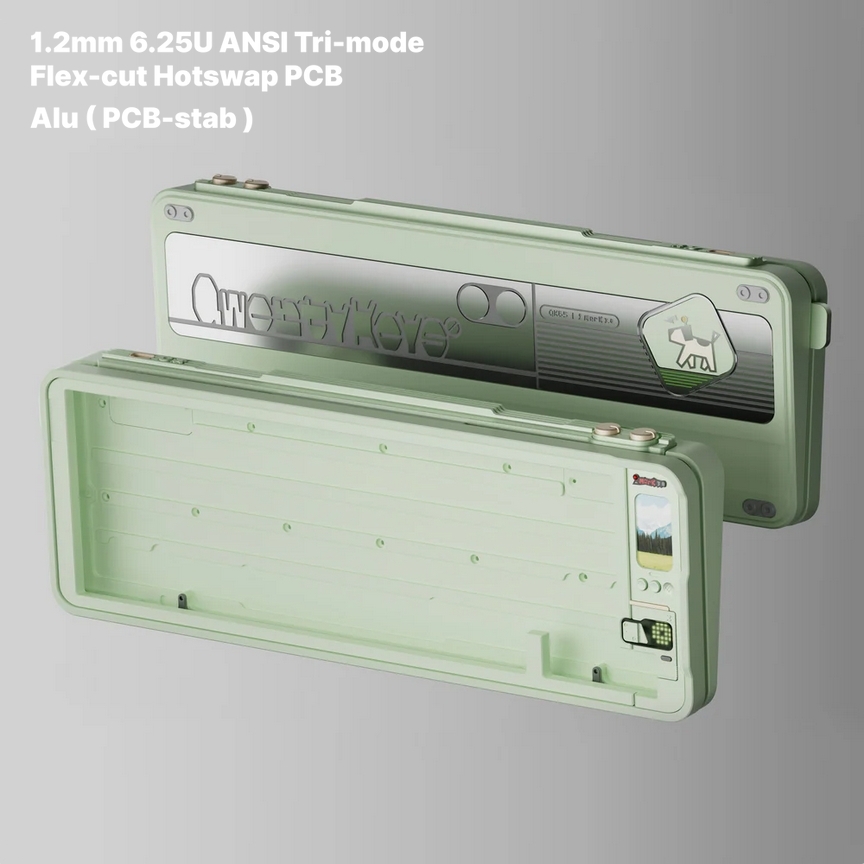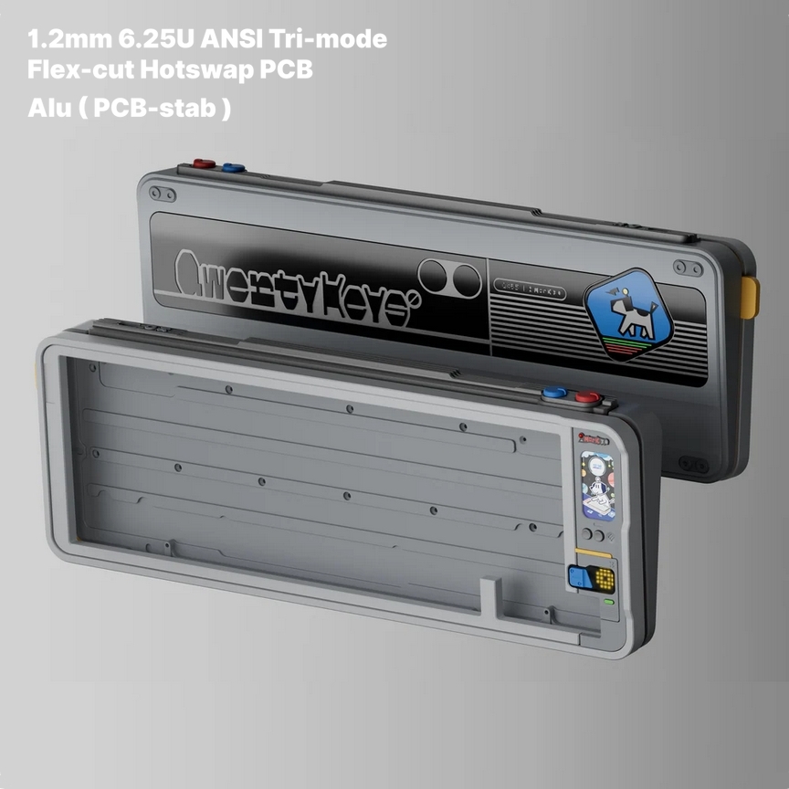 A 2,4 GHz-es rádióval, Bluetooth-szal vagy USB Type-C/Type-A madzaggal kommunikáló apparátus arzenáljából nem hiányzik a gombonként címezhető RGB világítás sem, és két, 3100 mAh-s kapacitású akkumulátorral érkezik. A gyártó saját, webes VIA forkja révén komoly programozhatósággal bíró tasztatúrát ISO és US ANSI kiosztással egyaránt összerakhatjuk, miközben nyomtatott áramköri lap, valamint plate tekintetében a következő opciók közül bökhetünk rá a nekünk tetsző(k)re: