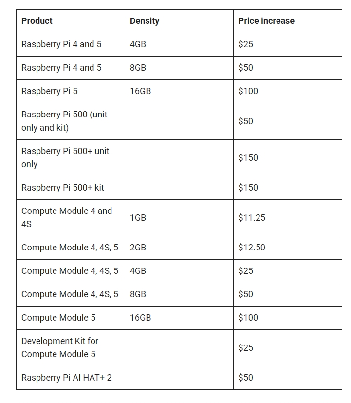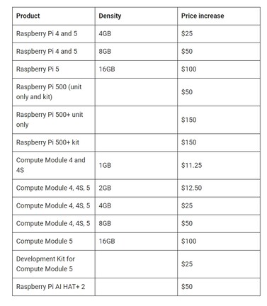 A vállalat a memóriaárak miatt kénytelen volt több meglévő termék árán is változtatni, és ennek mértékéről az alábbi képtáblázat ad felvilágosítást.
